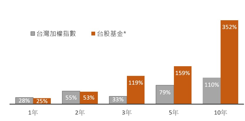 *台股基金係以投信投顧公會/分類為國內一般股票型共119檔基金績效平均