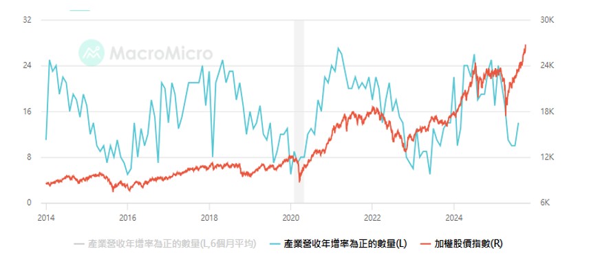 表. 台灣產業營收年增率為正的數量vs台股指數