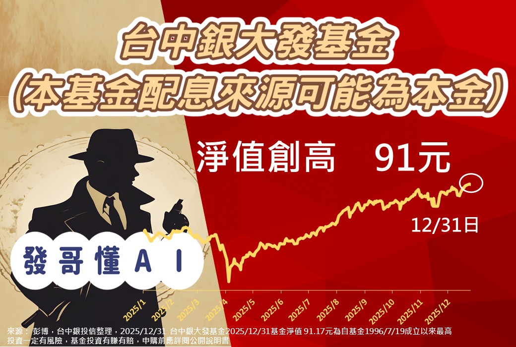 回顧 2025 年市場並非一路順風,台股基金展現韌性,據嘉實資訊統計,近一周(2025/12/24~31日)至少十檔台股基金淨值創歷史高,其中台中銀大發基金(本基金之配息來源可能為本金) 2025年多次突破前波高點,展現經理人台股研究實力。過往台股科技業第一季庫存調整進入淡季,但AI技術競賽縮短需求週期,估計台股淡季不淡成新常態。