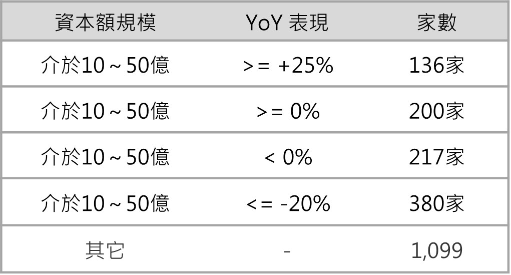 2月上市營收(資本額<50億)的家數累計達2032家。其中營收年增大於 25%有417家,年增小於-20%有588家,好壞營收差異大,若加上對產業趨勢判斷,不僅挑「廣度」也挑「強度」。