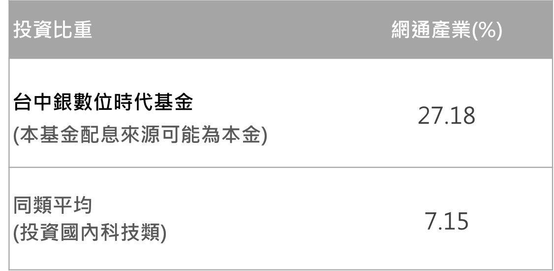 據公會統計,33檔台股科技基金當中,「台中銀數位時代」布局網通產業(低軌衛星etc.)比重較達27.18%,優於同類型基金平均布局8.03%。